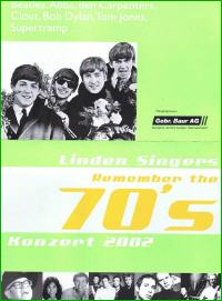 The Beatles, Abba, Bob Dylan usw. wer kennt sie nicht und denkt mit Wehmut an die grossen Hits der siebziger Jahre zurück. Unvergesslich sind sie, die Songs von Abba, den Carpenters, Clout, Bob Dylan, Tom Jones, Supertramp etc. Nach intensiver Probenarbeit haben wir unter der Leitung von Jimmy Muff einige dieser Ohrwürmer und Hitparadenstürmer aus den 70er Jahren zurückgebracht.